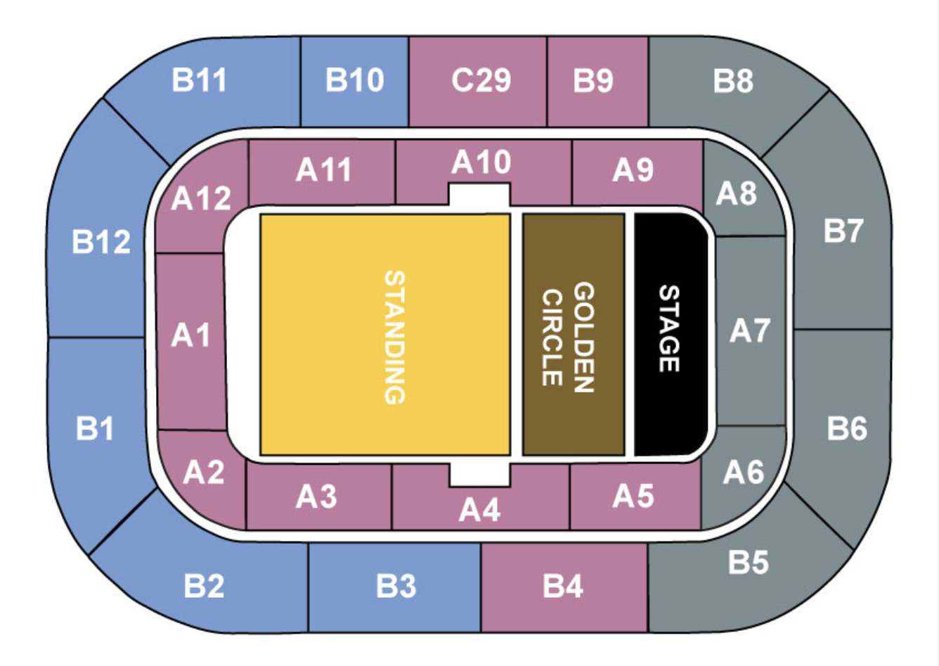 Vstopnice za sektor Front of Stage in parter so stojišča, vsi sektorji za tribuno so oštevilčena sedišča.